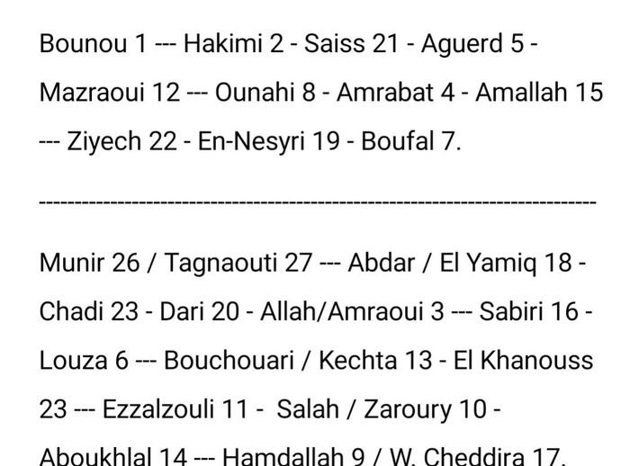 Bounou 1 --- Hakimi 2 - Koulibaly 3 - Aguerd 5 - Reinildo --- Fofana 19 - Amrabat 4 - Bennacer 8 ---- Salah 11 - Osimhen 9 - Mane 10....